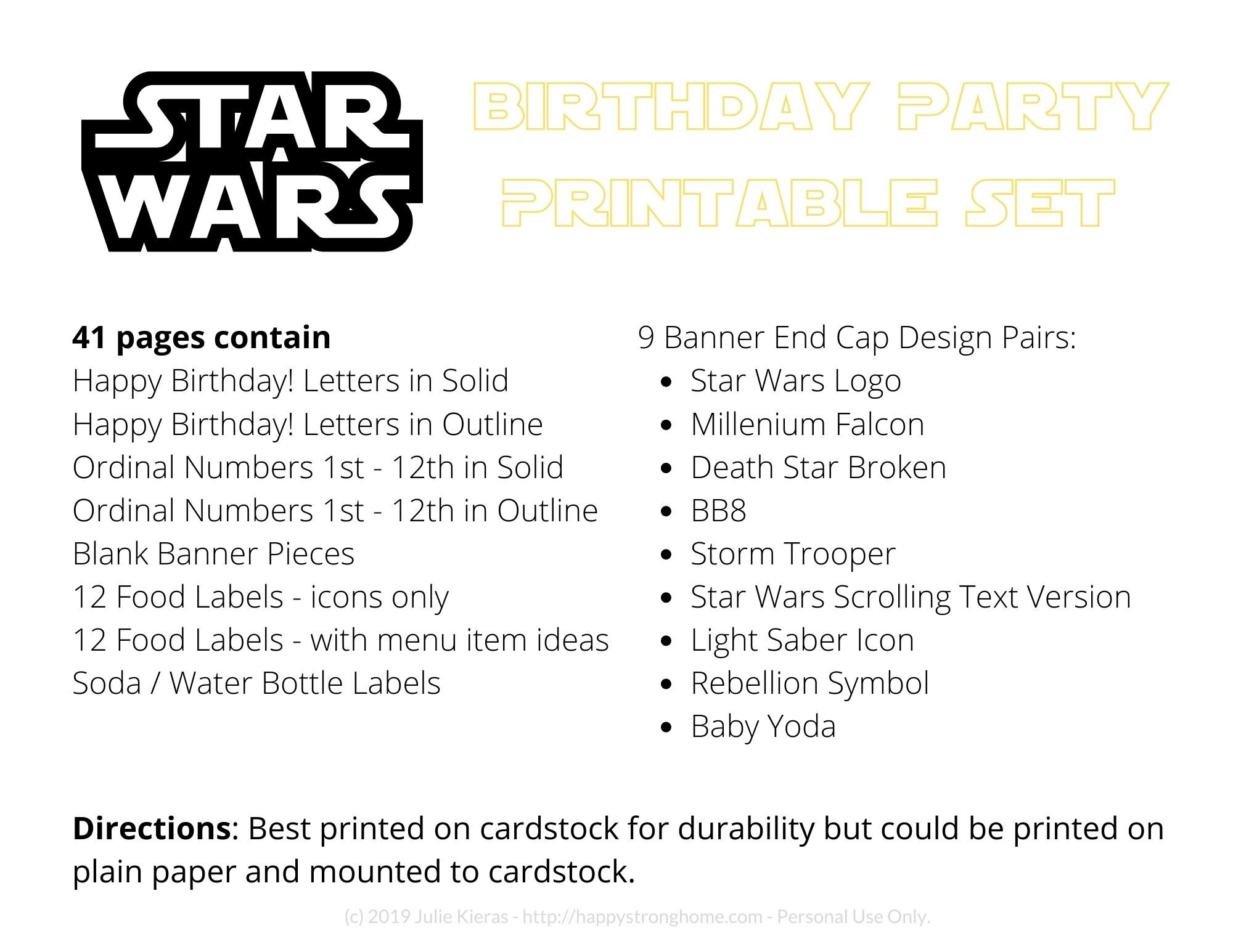 Star Wars Party Printables and Epic Ideas - All Things with Purpose With the release of Episode Seven, Star Wars fever has been rekindled and I thought it'd be a great time to revisit some of my ideas and do some UPDATES to my original printable. What the printable pack includes: Invitation postcards; Thank you note postcards; Menu/food label signs; Blank labels; Game and activity center signs; Banners ...