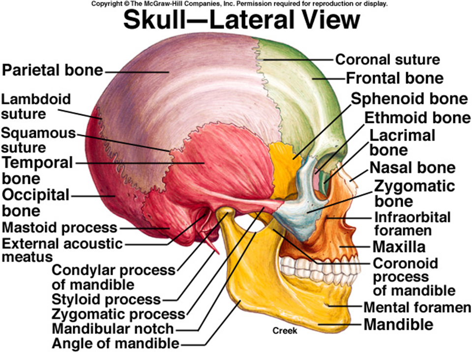 Lateral view of skull with labels